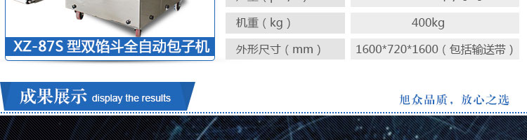 XZ-87S型雙餡斗全自動包子機,可生產各種肉包、肉菜包、菜包、小籠包、湯包、水晶包、圓饅頭、奶黃包、豆沙包、叉燒包、南瓜餅等幾十種包餡制品。適用于賓館、飯店、學校、機關企業(yè)食堂、饅頭或包子加工廠、早餐工程店及速凍食品廠等單位??蓾M足不同客戶群體。免費提供工藝技術。免費上門培訓指導安裝。