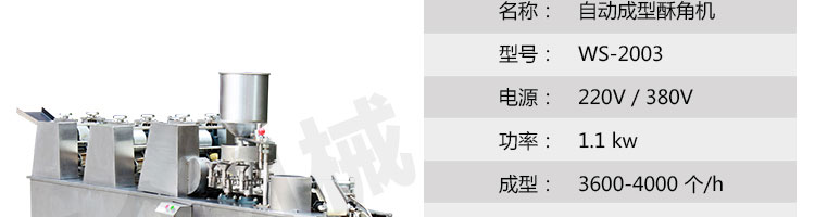 WS-2003 型自動成型酥角機(油餃機),適用于制作酥角、油餃,可包的餡有:花生、椰蓉、白糖等。適合多種面粉材料、并且成型封口美觀牢固。小模約47mm,大模約57mm隨機標(biāo)配一套模具。購機贈送工藝配方。