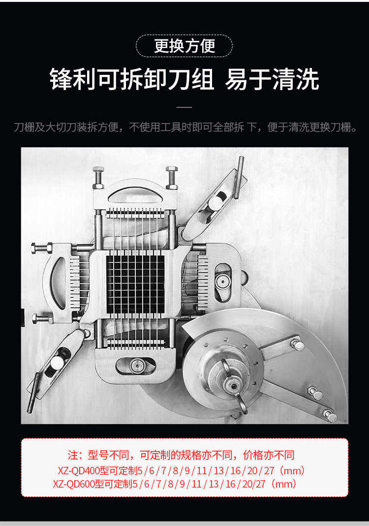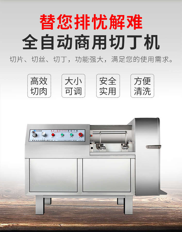 XZ-QD400切丁機(jī),替您排憂解難全自動商用切丁機(jī)切片、切絲、切丁,功能強(qiáng)大,滿足您的使用需求。多功能&實用人即可操作,切出自己想要的規(guī)格,滿足商用多種需求。