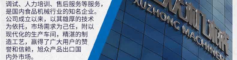 廣州旭眾食品機(jī)械有限公司是一家集科研開發(fā),生產(chǎn)設(shè)計,營銷服務(wù)為一體的現(xiàn)代化生產(chǎn)企業(yè)?,F(xiàn)代化生產(chǎn)車間,精湛制造技術(shù),所產(chǎn)機(jī)械歷經(jīng)市場重重考驗,不斷贏得海內(nèi)外客戶的贊譽。