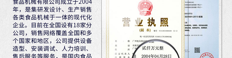 廣州旭眾食品機(jī)械有限公司是一家集科研開(kāi)發(fā),生產(chǎn)設(shè)計(jì),營(yíng)銷(xiāo)服務(wù)為一體的現(xiàn)代化生產(chǎn)企業(yè)。現(xiàn)代化生產(chǎn)車(chē)間,精湛制造技術(shù),所產(chǎn)機(jī)械歷經(jīng)市場(chǎng)重重考驗(yàn),不斷贏得海內(nèi)外客戶(hù)的贊譽(yù)。